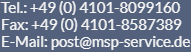 Alle weiteren Bilder, Fotos, Texte und sonstige Informationen auf dieser Webpräsenz sind das Eigentum der Firma msp service GmbH & Co. KG. Jegliche Verwendung oder Veröffentlichung ist nicht gestattet.